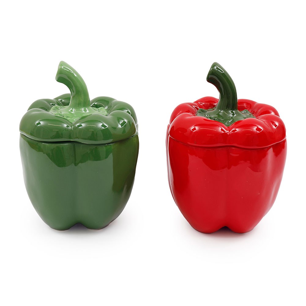 Shaped like a red and green pepper, these 15cm lidded jars bring a playful touch to any space. A quirky piece perfect for storing treats and small essentials. Priced per piece and sold as a set of 2, equally assorted.