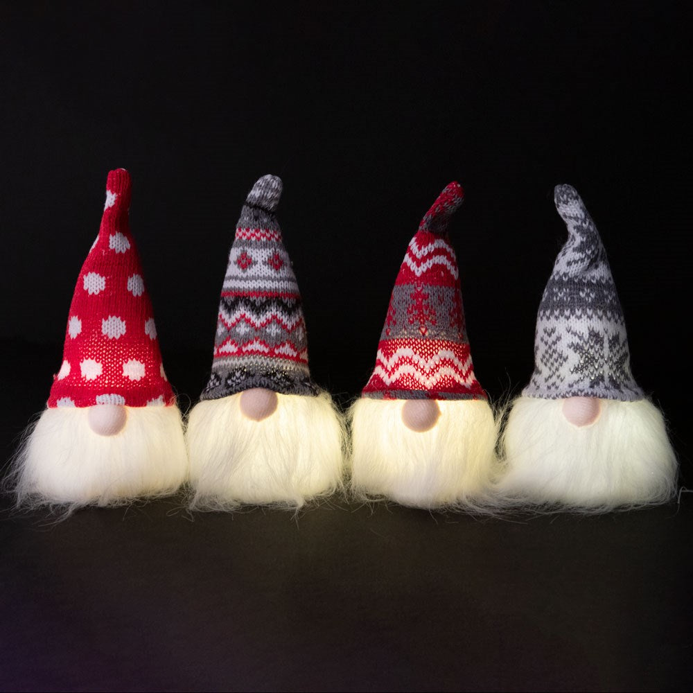 4 styles of freestanding LED Gonk ornaments in nordic style knitted hats. Picked randomly.