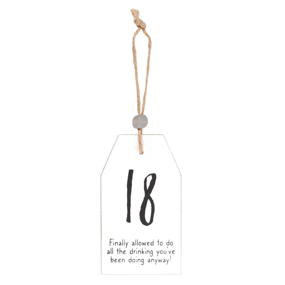 A small tag-shaped sign perfect for celebrating a milestone birthday. Features text that reads, '18 - Finally allowed to do all the drinking you've been doing anyway!' and finished with a wooden bead. Designed by Something Different Wholesale and part of the Hanging Sentiment Sign range.