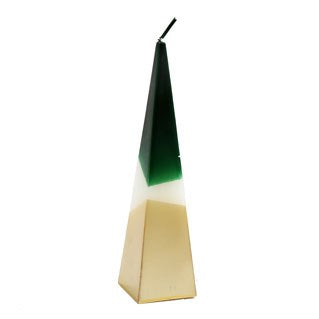 A pyramid shaped candle in a modern green and gold dipped design. Approximately 20cm.