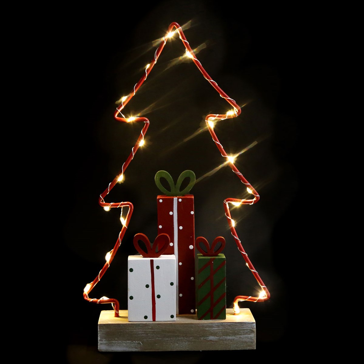 Add a warm glow to the home with this light up LED Christmas decoration, featuring presents piled at its base. Perfect for decorating bookshelves, mantlepieces or windows to spread Christmas cheer.