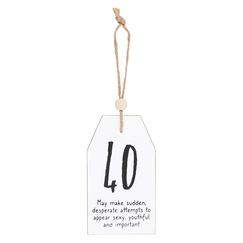 A small tag-shaped sign perfect for celebrating a milestone birthday. Features text that reads, '40 - May make sudden desperate attempts to appear sexy, youthful and important' and finished with a wooden bead. Designed by Something Different Wholesale and part of the Hanging Sentiment Sign range.