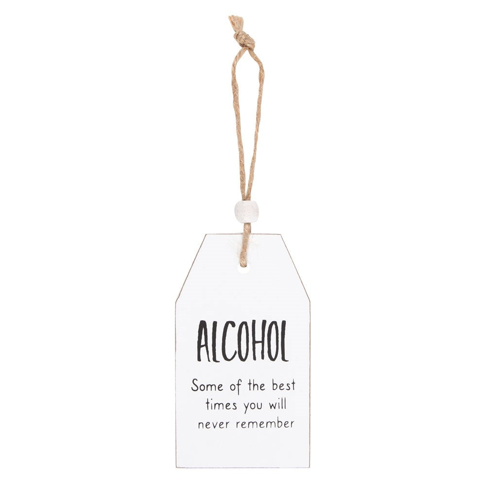A small tag-shaped sign perfect for birthdays and other special occasions. Features text that reads, 'Alcohol. Some of the best times you will never remember' and finished with a wooden bead. Designed by Something Different Wholesale and part of the Hanging Sentiment Sign range.