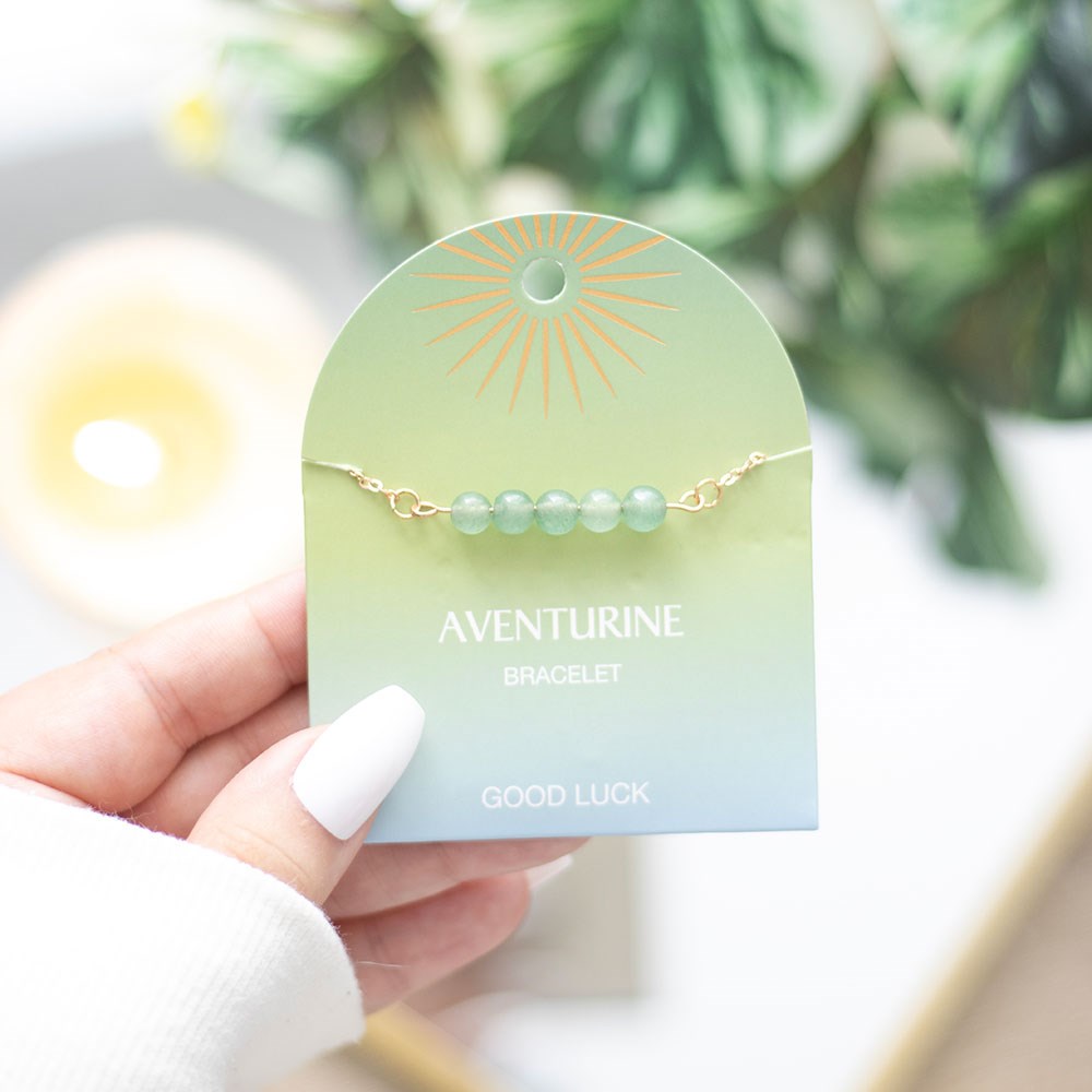 Carry the positive energy of crystal healing on-the-go with this crystal beaded chain bracelet. Featuring 5 aventurine crystal beads known for promoting luck and prosperity, attached to an elegant yet durable gold-tone chain. Ideal for stacking or wearing individually for a touch of elegance to any outfit. Add a zodiac charm to the bracelet for a personalised touch (sold separately). Available as part of a countertop spinner stand with other crystal jewellery and in a set of 9 for top ups. Jewellery is nickel-free stainless steel. Designed by Something Different Wholesale and part of the Crystal Charm Jewellery range.
