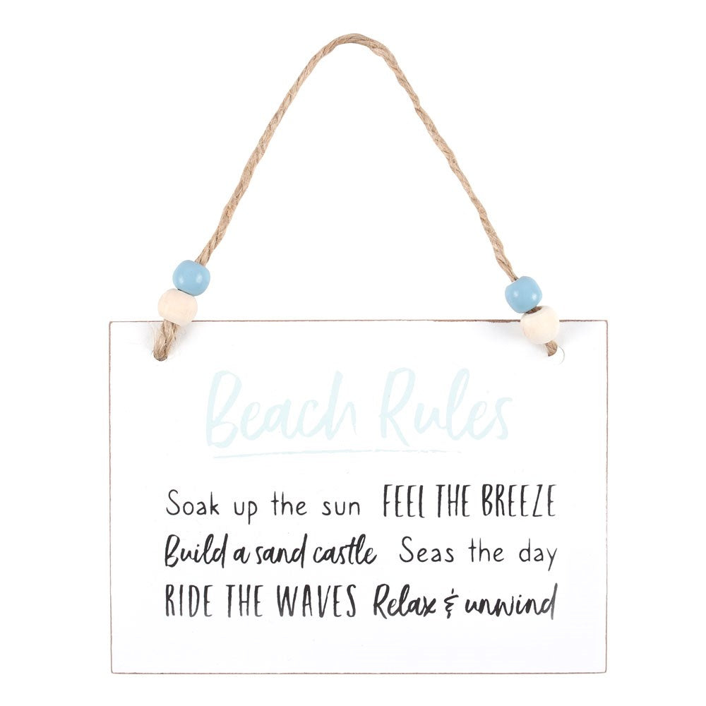 A cute hanging sign perfect for any beach house or nautical home. Features text that reads, 'Beach Rules: Soak up the sun, Feel the breeze, Build a sand castle, Seas the day, Ride the waves, Relax & unwind' and finished with four wooden beads. Designed by Something Different Wholesale and part of the Hanging Sentiment Sign range.