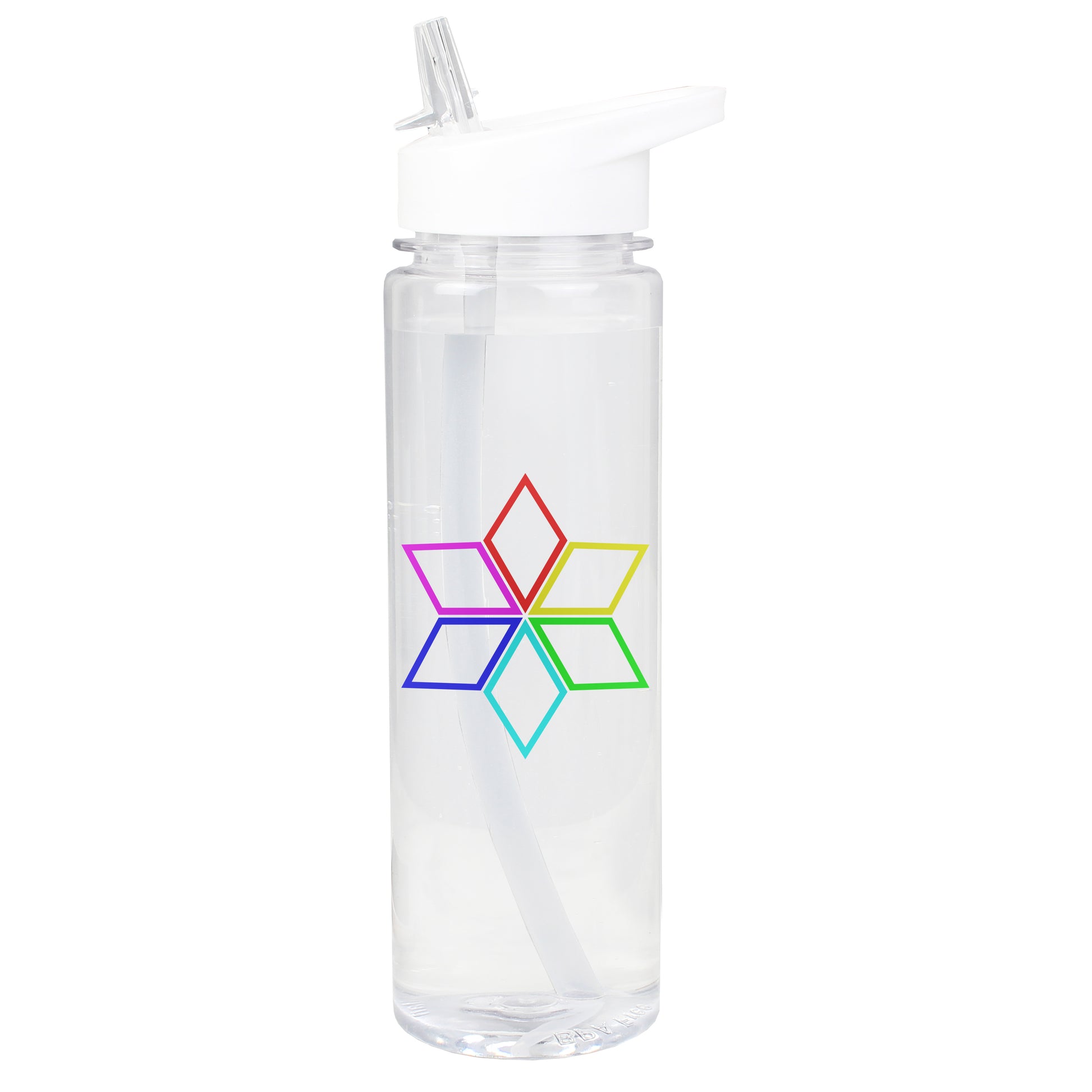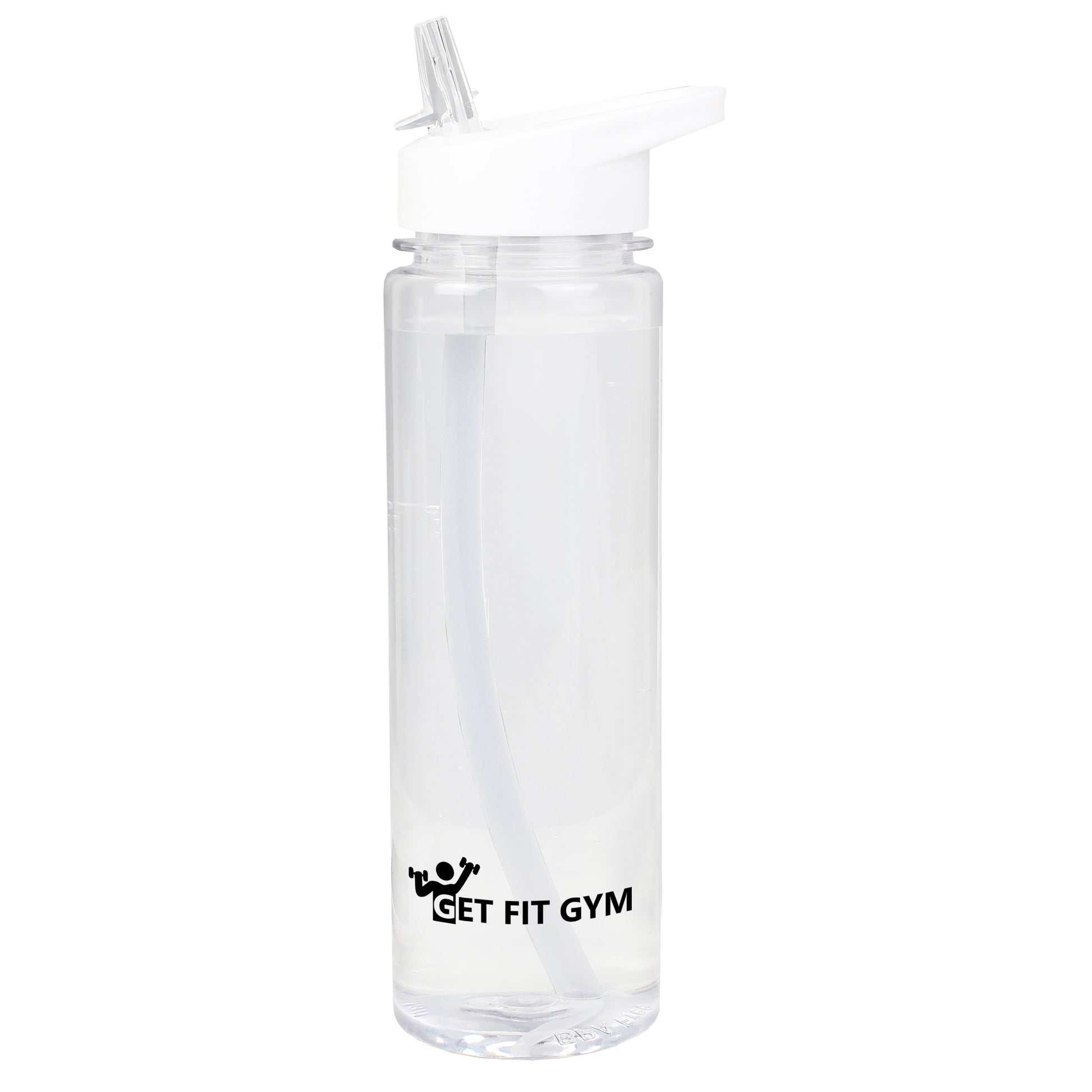 The bottle features a white twist-on lid, clear concealable flip-top drinking spout attached to a straw.