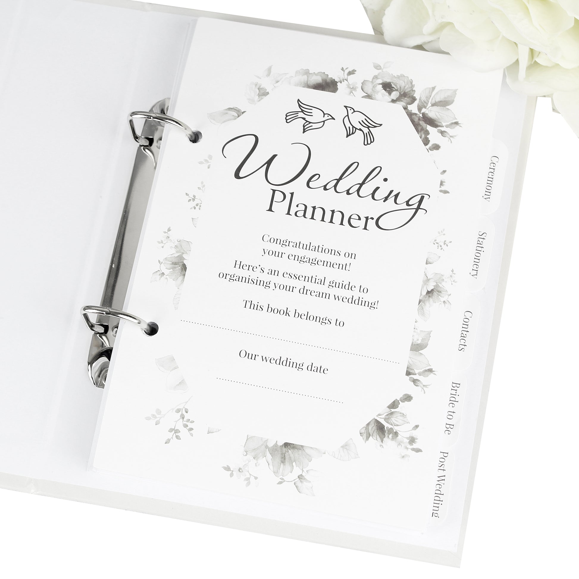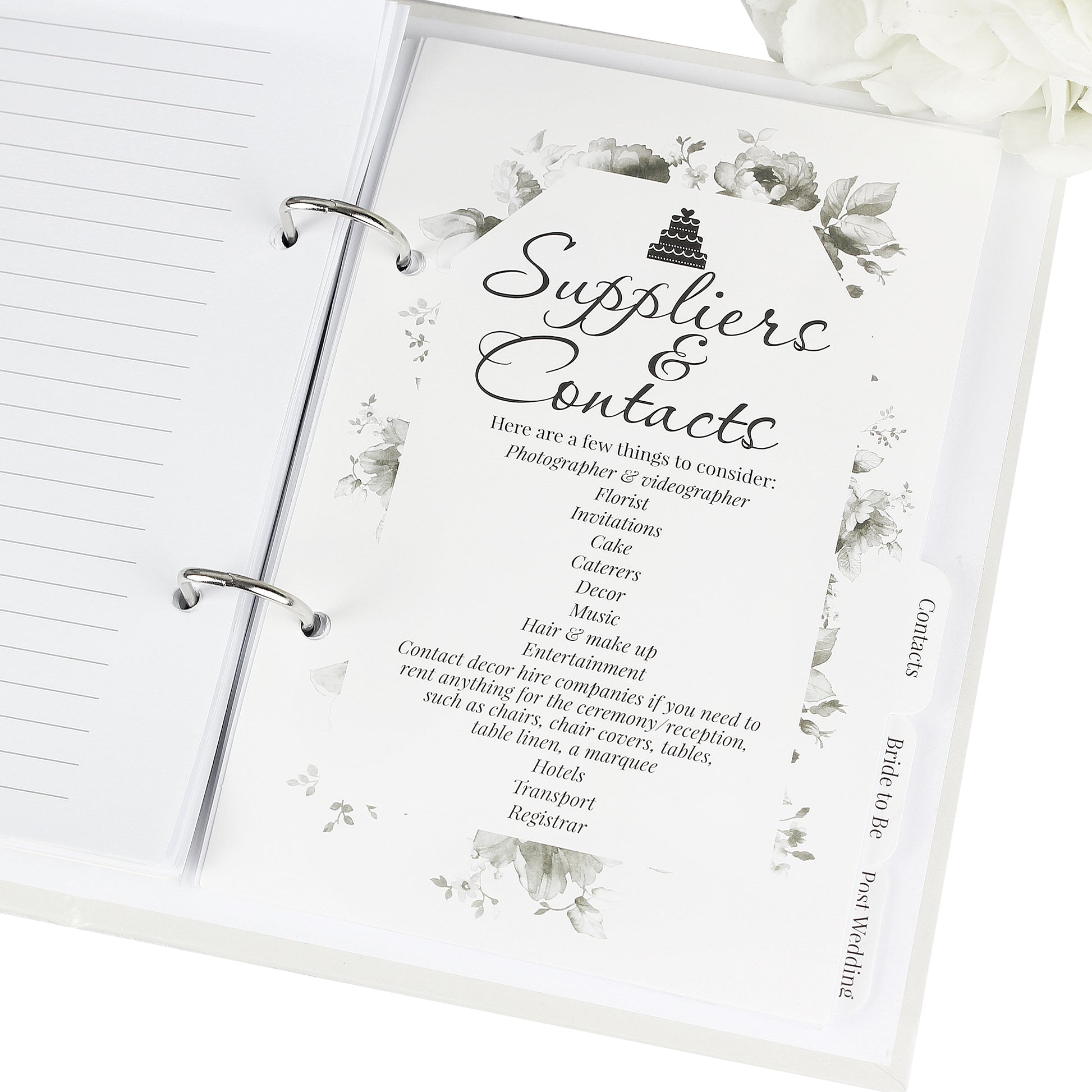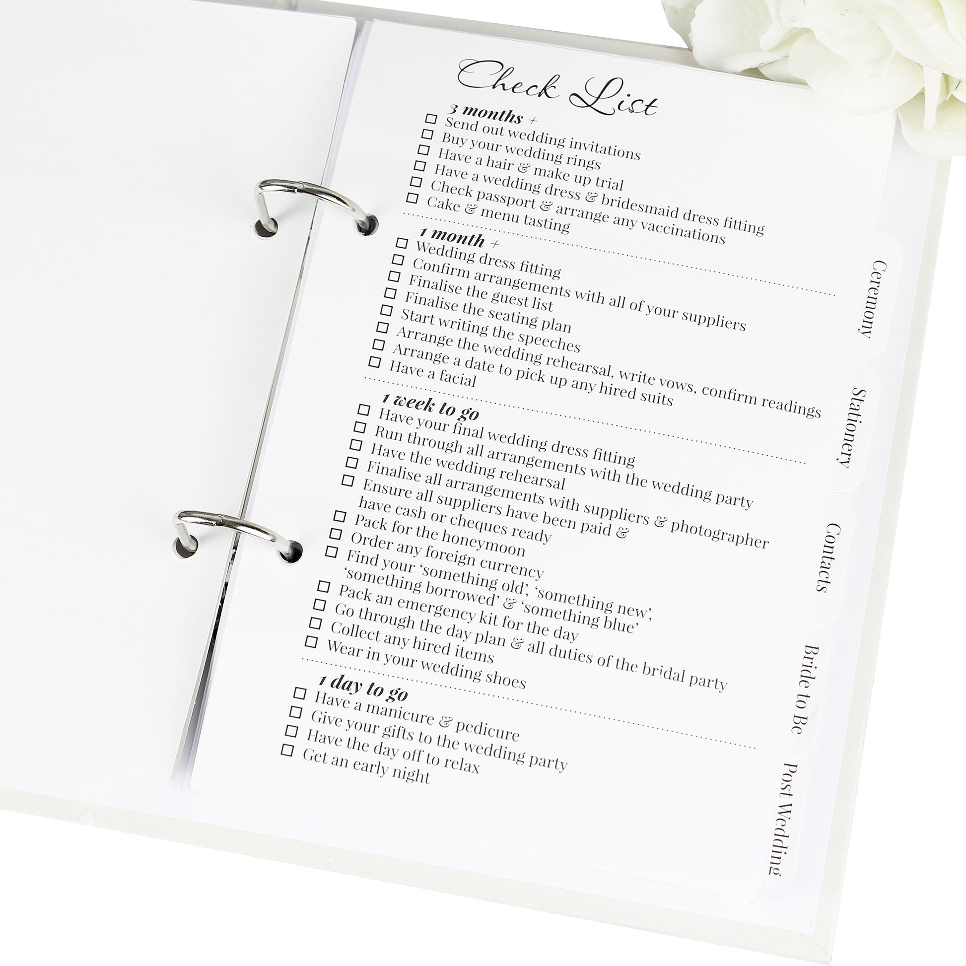 This ring-bound wedding planner includes sections for the ceremony, stationery, contacts, Bride to be and post wedding.
