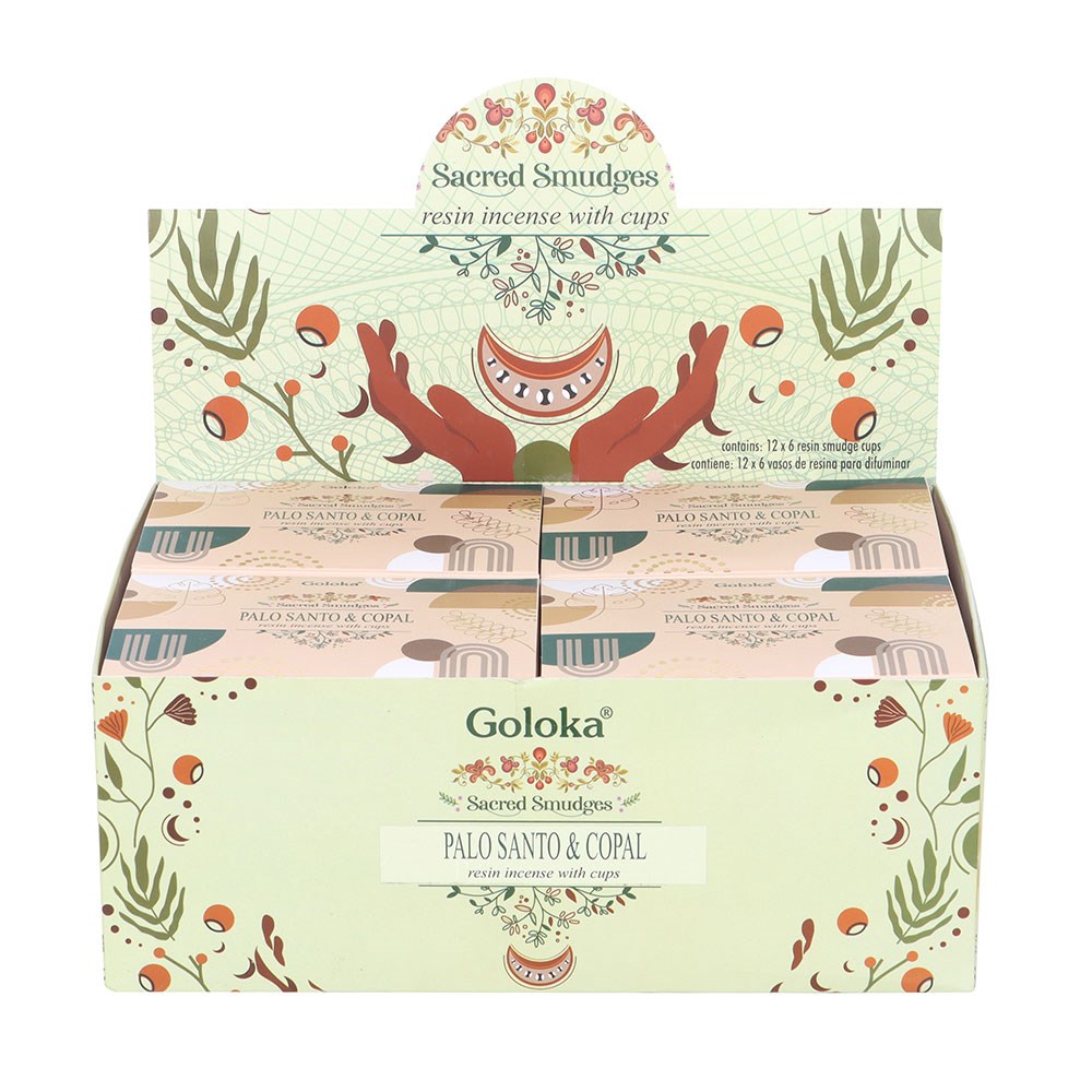 Fill your space with the calming blend of Palo Santo and Copal, perfect for clearing negative energy and promoting spiritual harmony. This smudge cup is made from a unique blend of resin incense, herbs, and essential oils held inside a convenient charcoal cup for easy use. Simply light the top of the cup to release the calming fragrance, ideal for meditation, relaxation, or ritual cleansing. Sold in multiples of 12 packs, each with 6 smudge cups inside, and part of the Sacred Smudges range from Goloka. Burn on a fireproof surface and allow the cup to cool completely before touching.