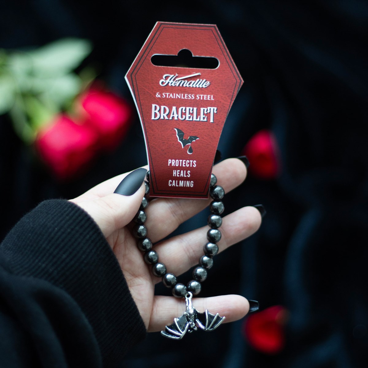 This gothic bat bracelet makes a unique piece to add to any jewellery collection. The hematite beads offer grounding energy, while the exquisitely detailed, stainless steel bat charm adds a touch of mystique. Presented on a matching tag. Exclusively designed by Something Different as part of the Victorian Vampire range of gothic gifts and home decor.