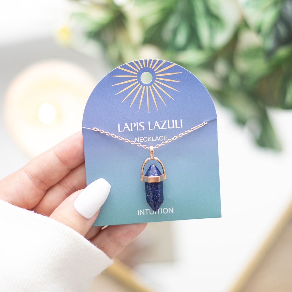 Carry the positive energy of crystal healing on-the-go with this crystal pendant necklace. Featuring a lapis lazuli crystal point known for promoting intuition and wisdom, attached to an elegant yet durable gold-tone chain. Add a zodiac charm to the necklace for a personalised touch (sold separately). Available as part of a countertop spinner stand with other crystal jewellery and in a set of 9 for top ups. Jewellery is nickel-free stainless steel. Designed by Something Different Wholesale and part of the Crystal Charm Jewellery range.