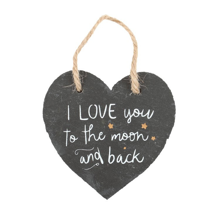 Add a touch of rustic charm to any loving home with this sweet slate heart decoration with timeless 'I love you to the moon and back' text. Designed by Something Different Wholesale.