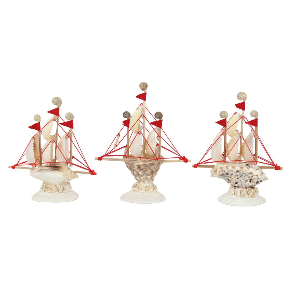 A variety of shells are arranged into the shape of a galleon ship on this seaside souvenir. Perfect for quick holiday gifts and beach mementos.