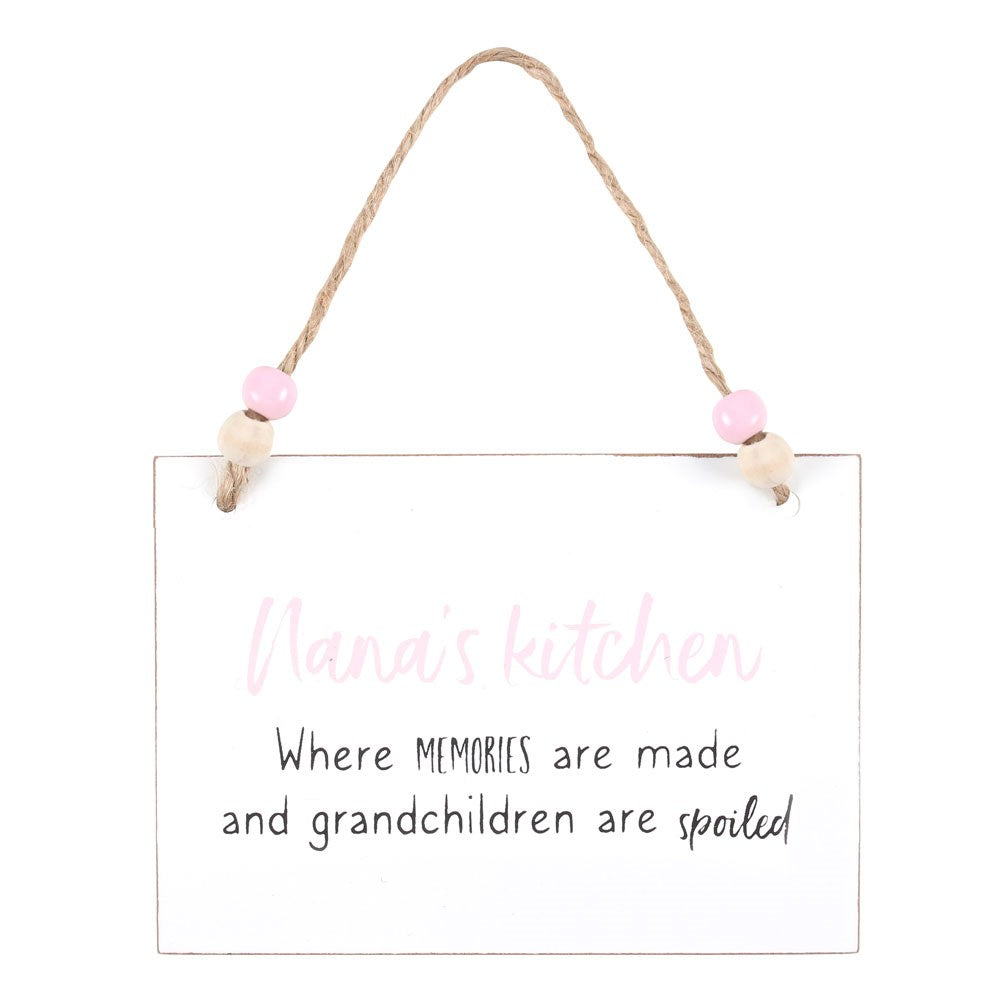 A light-hearted hanging sign perfect for any grandma. Features text that reads, 'Nana's kitchen - Where memories are made and grandchildren are spoiled' and finished with four wooden beads. Designed by Something Different Wholesale and part of the Hanging Sentiment Sign range.