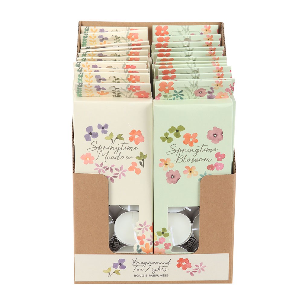 Bring the fresh scent of spring into the home with these delightful tealights, featuring two assorted floral designs and scents - Springtime Blossom and Springtime Meadow. Presented in a matching carboard display box, these fragranced tealights make a lovely addition to Easter celebrations, Mother’s Day gifts, or simply for the home during springtime. Priced per pack. 2 assorted designs with 10 packs of each scent included.