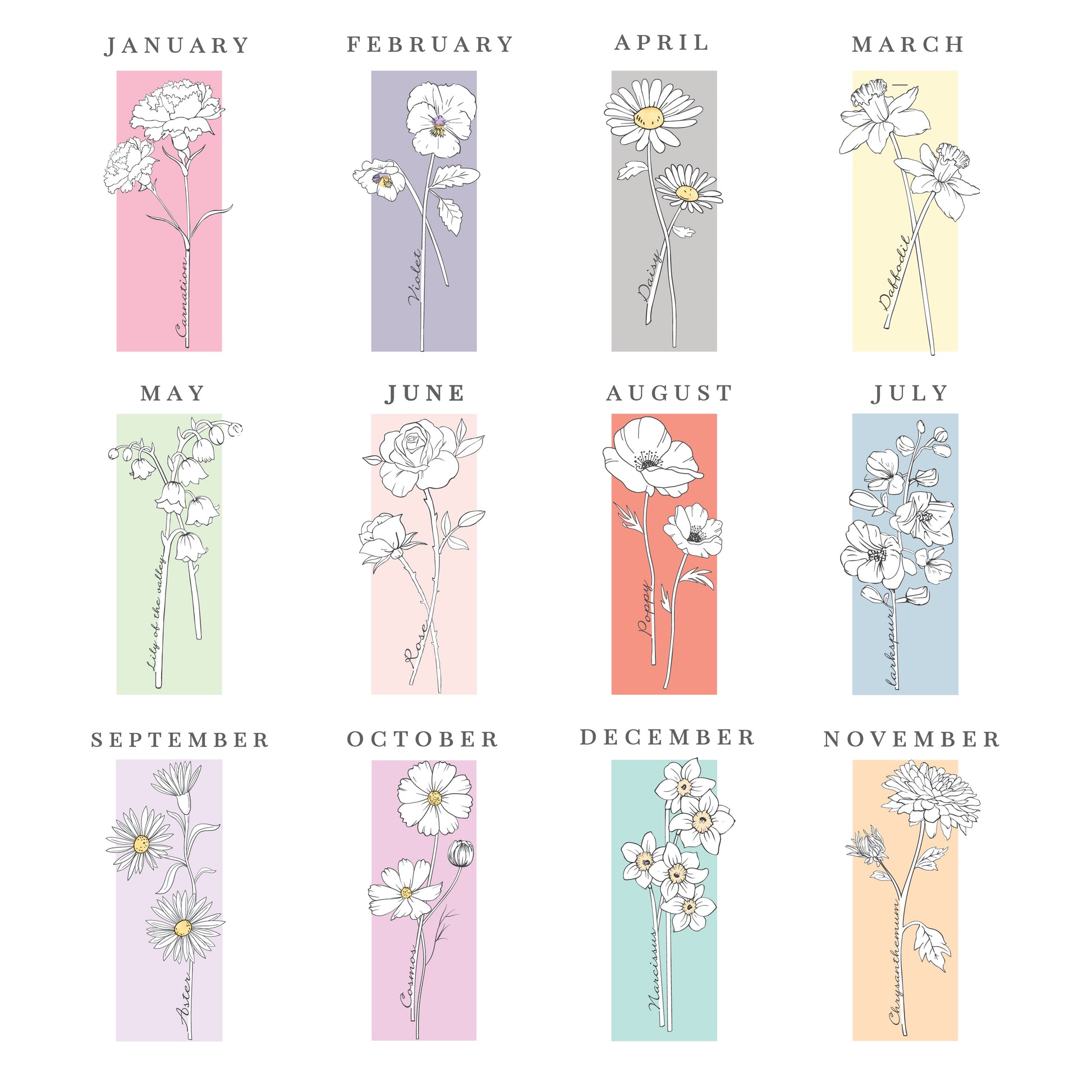 Please note, the name of the month and flower are fixed elements of the design and cannot be amended or removed