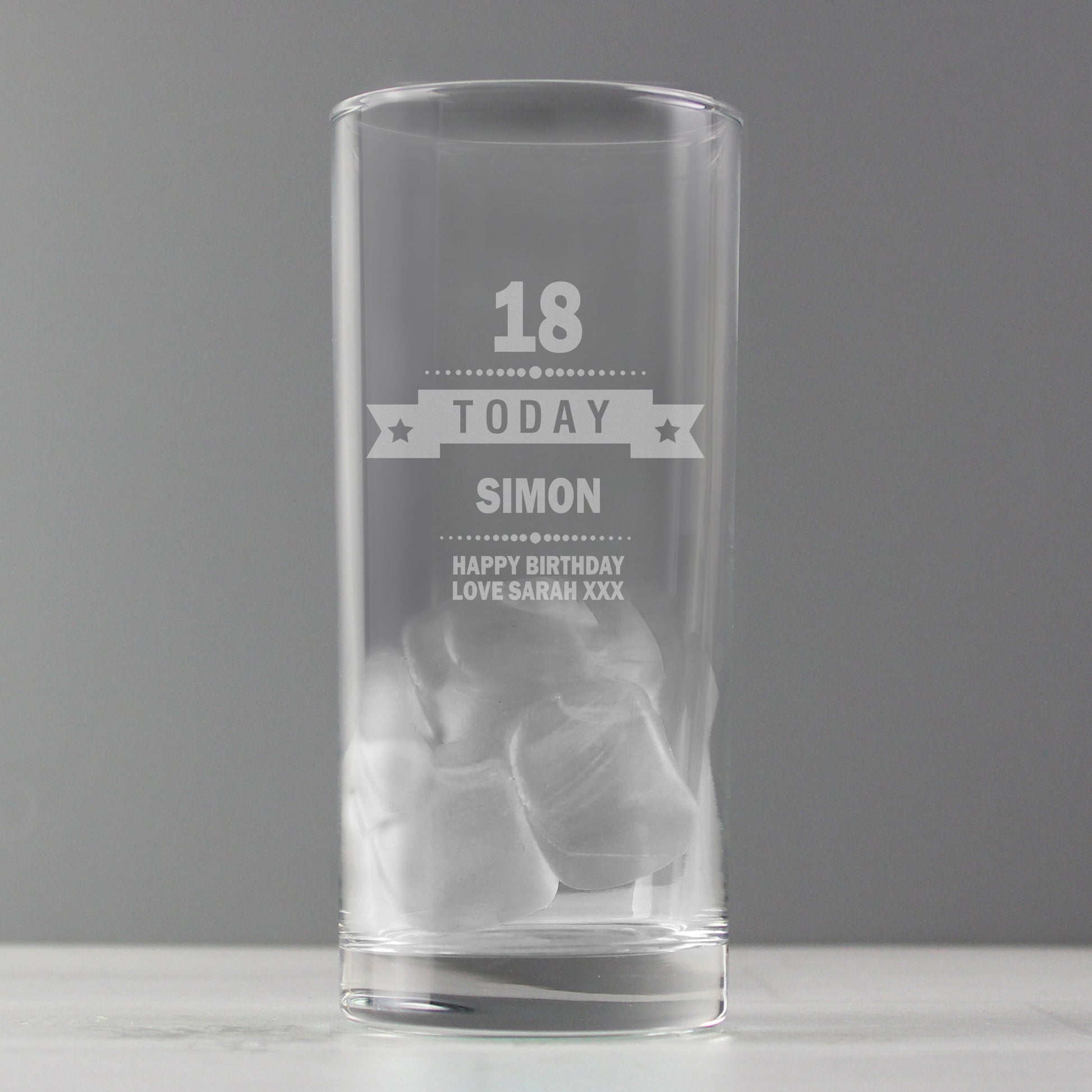 Personalise this Birthday Star Hi Ball Glass with an age up to 2 characters, a name up to 12 characters and up to 2 lines of 20 characters for a message.