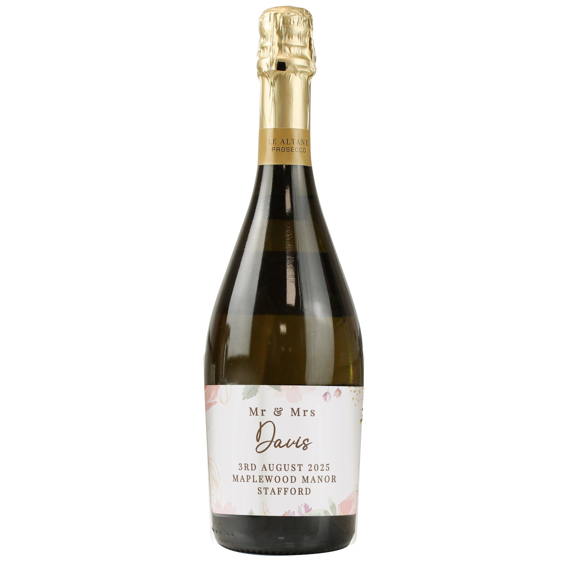 You can personalise this soft floral design Prosecco with 5 lines of text, as below