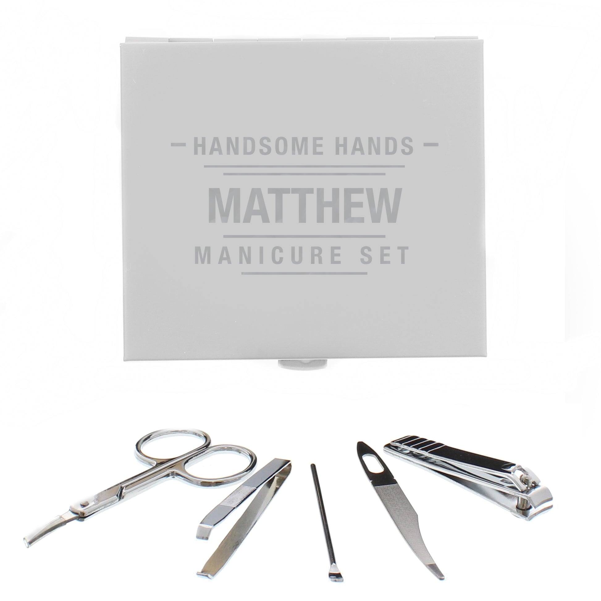 Personalise with a name up to 12 characters. The words 'HANDSOME HANDS' and 'MANICURE SET' are fixed. All personalisation is case sensitive and will appear as entered.