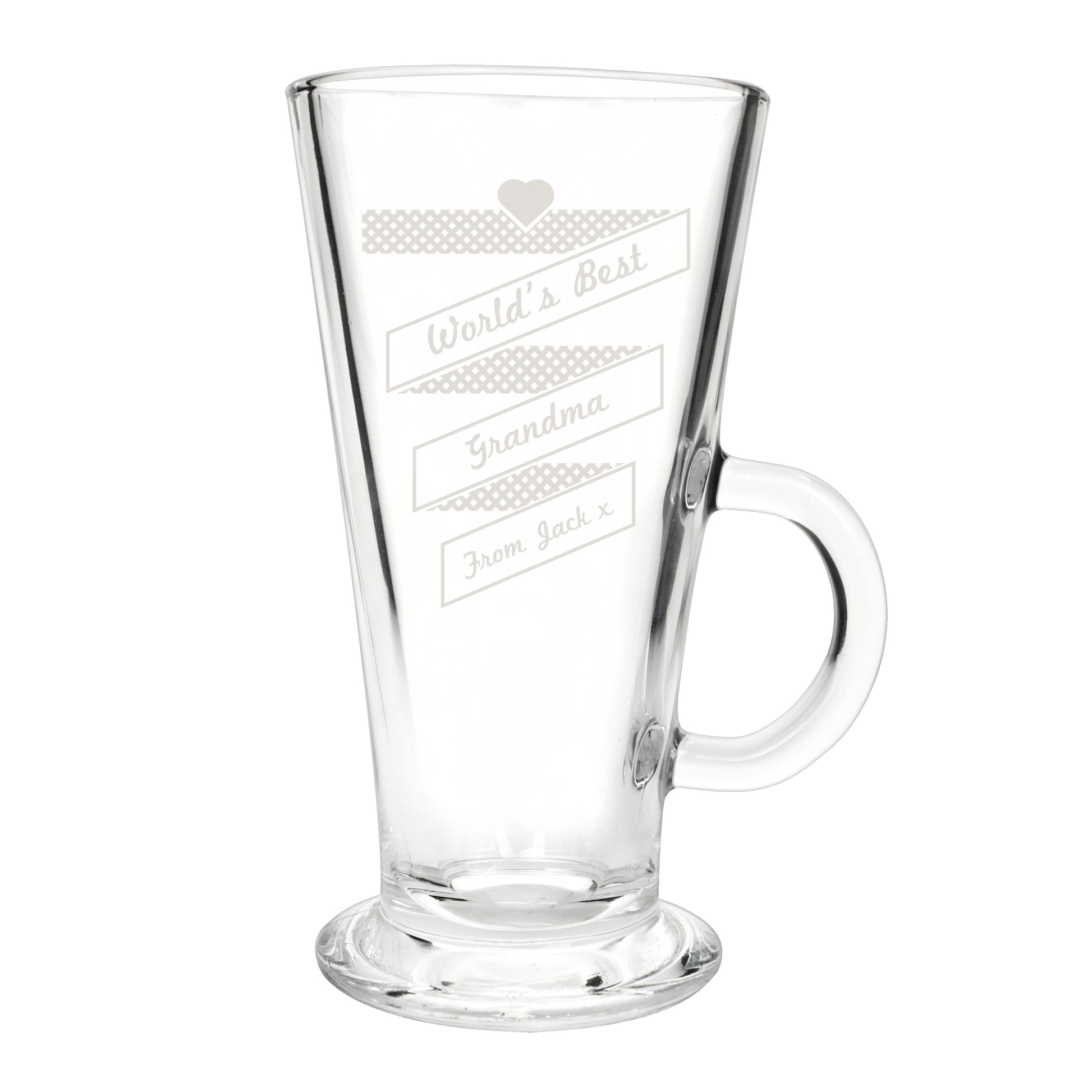 You can personalise this latte glass with 3 lines of text. Line 1 will hold 15 characters in length and lines 2 & 3 will hold 12.