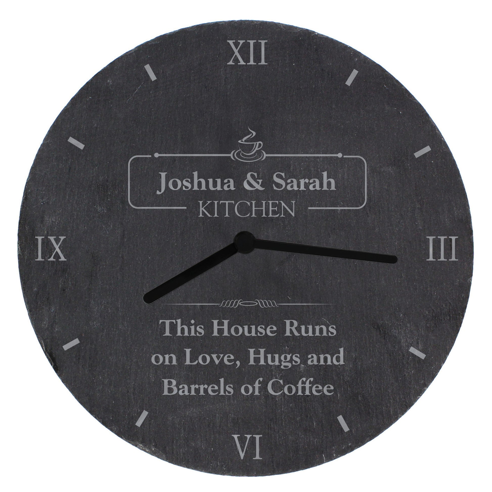 You can personalise this slate clock with a name/s up to 18 characters long (which will appear inside the banner). The word 'KITCHEN' is fixed. You can then personalise with a message over 3 lines up to 21 characters long. All personalisation is case sensitive and will appear as entered.