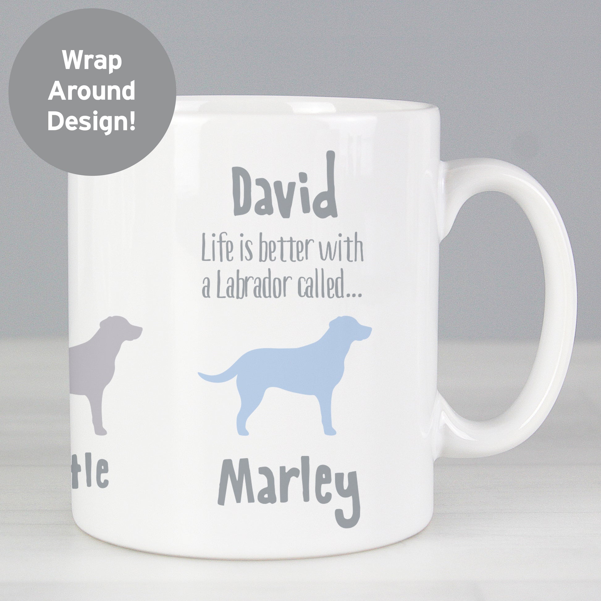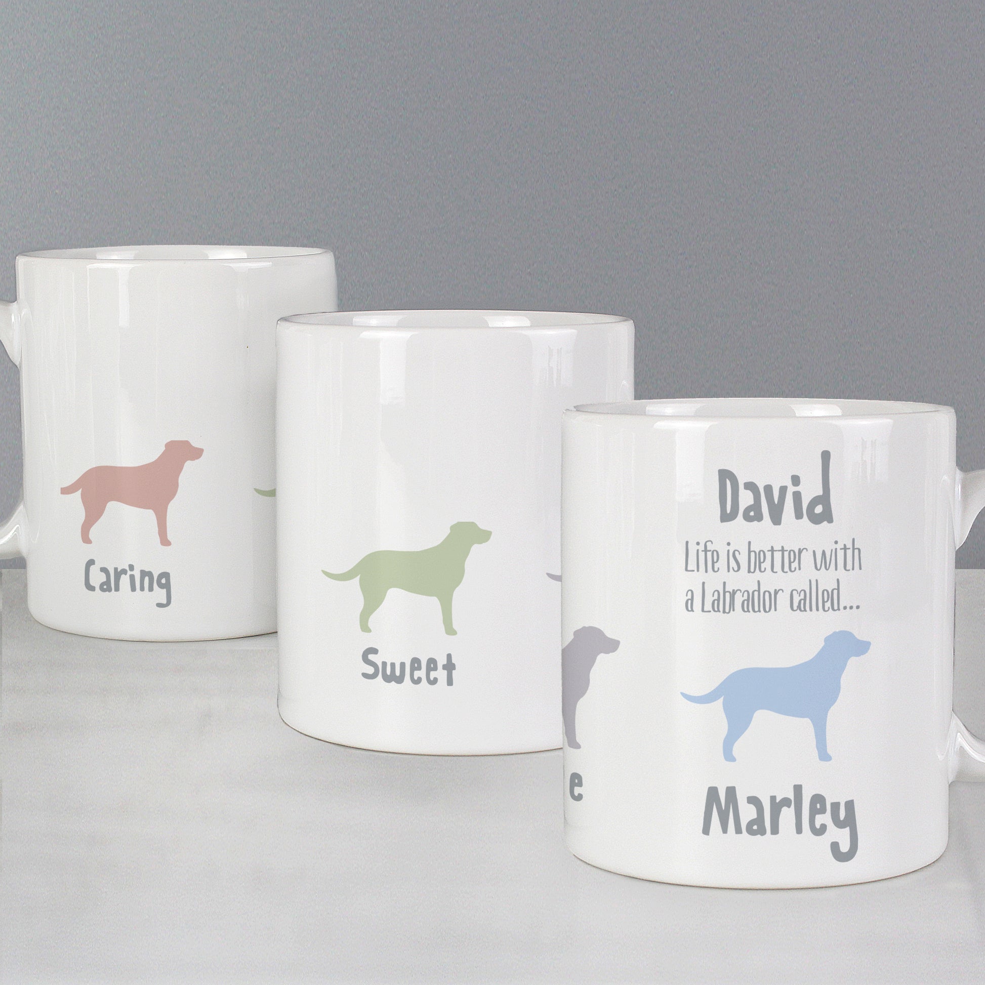 This Labrador Mug can be personalised on the front with 4 lines of text. Line 1 & 4 (the names) can hold up to 15 characters per line and Lines 2 & 3 can hold up to 40 characters per line. You can then have 3 descriptive words which can hold up to 12 characters each.