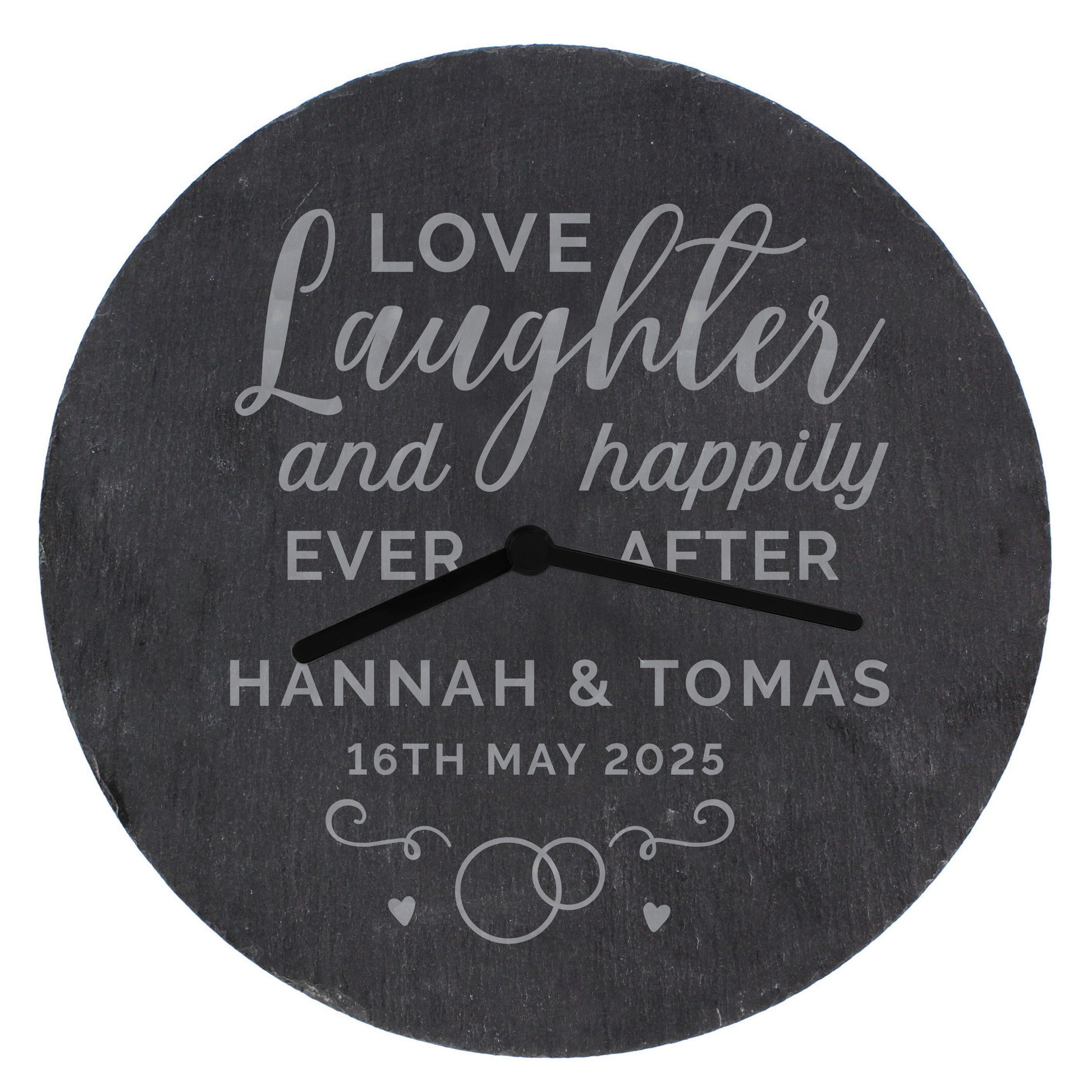This Love Laughter Slate Clock can be personalised with up to 2 lines of text