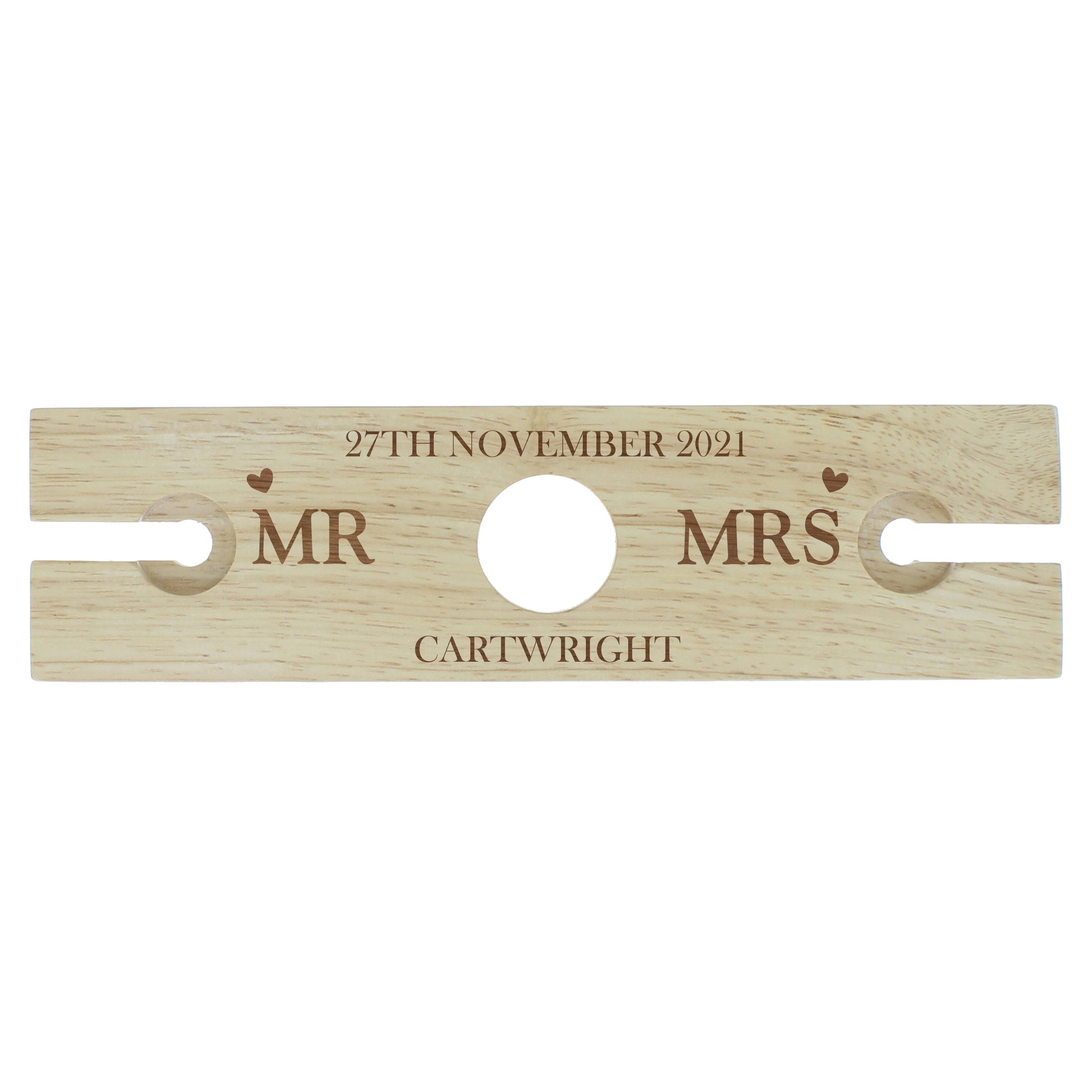 Personalise this bottle and wine glasses holder with a date, a surname and 2 titles.