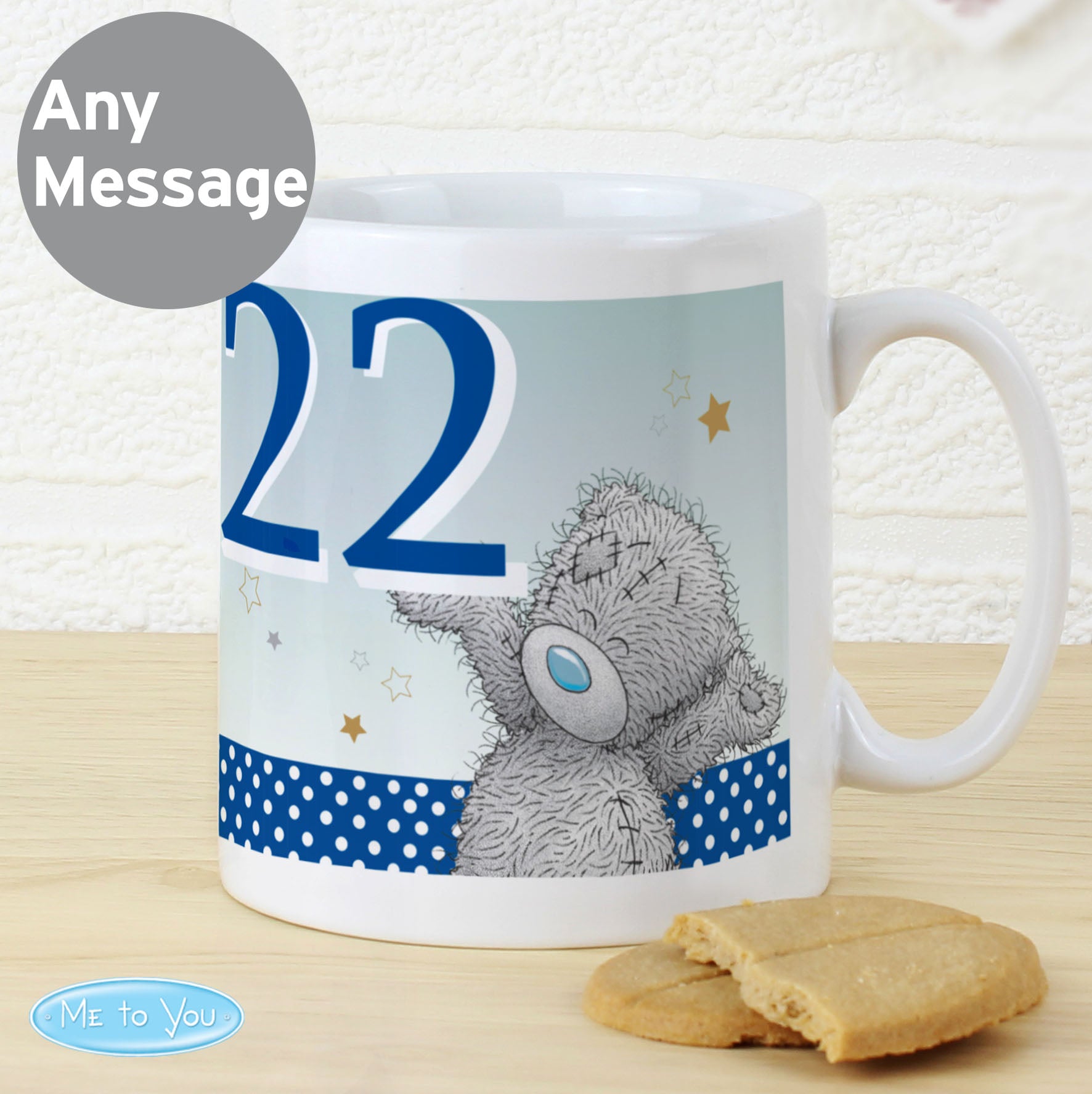 Personalise this mug with a number on the front up to 2 characters in length. The reverse of the mug can be personalised with a message over 4 lines up to 20 characters per line. All personalisation is case sensitive and will appear as entered.