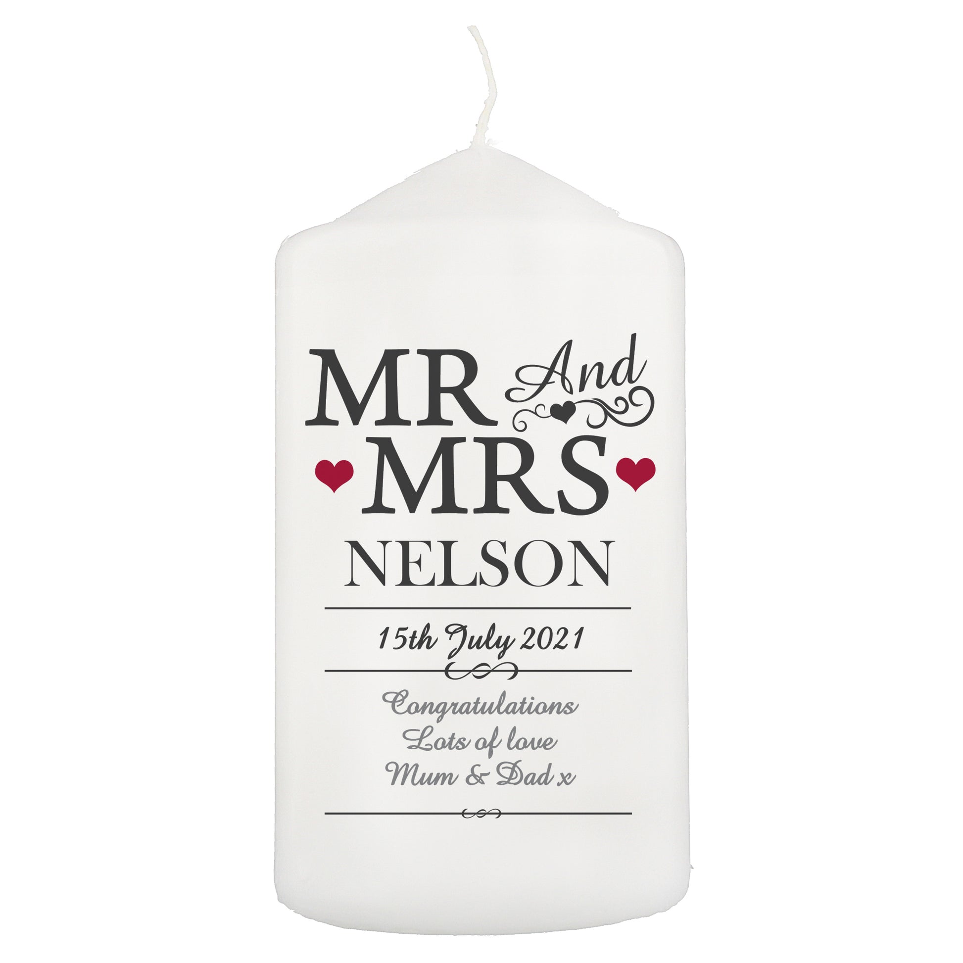 Personalise this Mr & Mrs Candle with a surname up to 15 characters, a date up to 20 characters and 3 lines of message, 15 characters per line