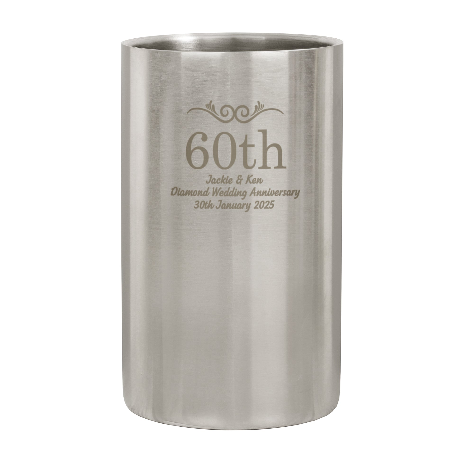 Personalise this Number Frame Stainless Steel Wine Cooler with a number up to 5 characters (i.e. 25th for anniversary or 40 for a birthday) and up to 3 lines of 30 characters each for your message.