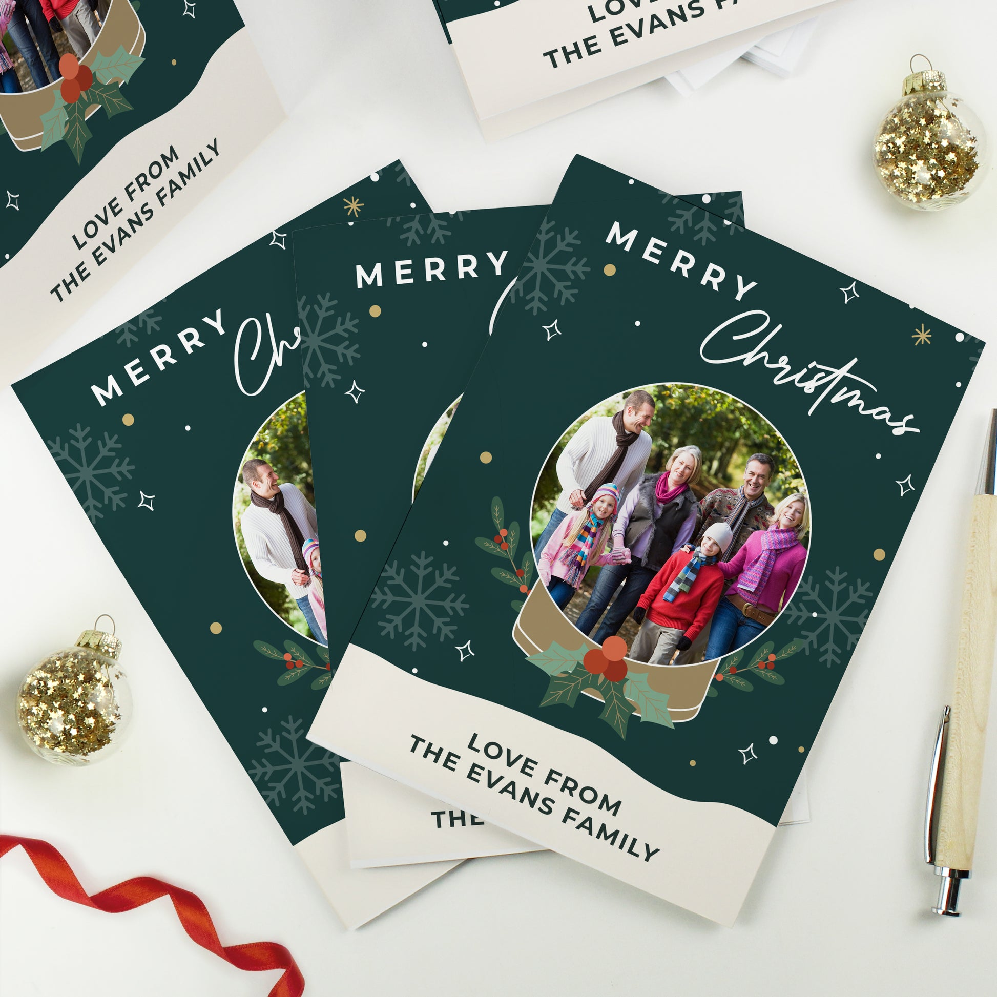 Featuring a classic, fixed text Merry Christmas and Snow globe design, these cards bring warmth, joy, and a personal touch to your holiday greetings.
