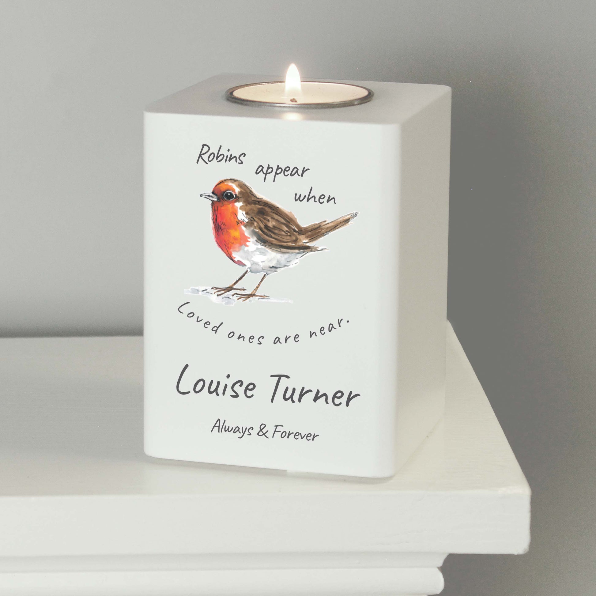Light a candle for a loved one with this special personalised Robin memorial wooden tea-light holder.