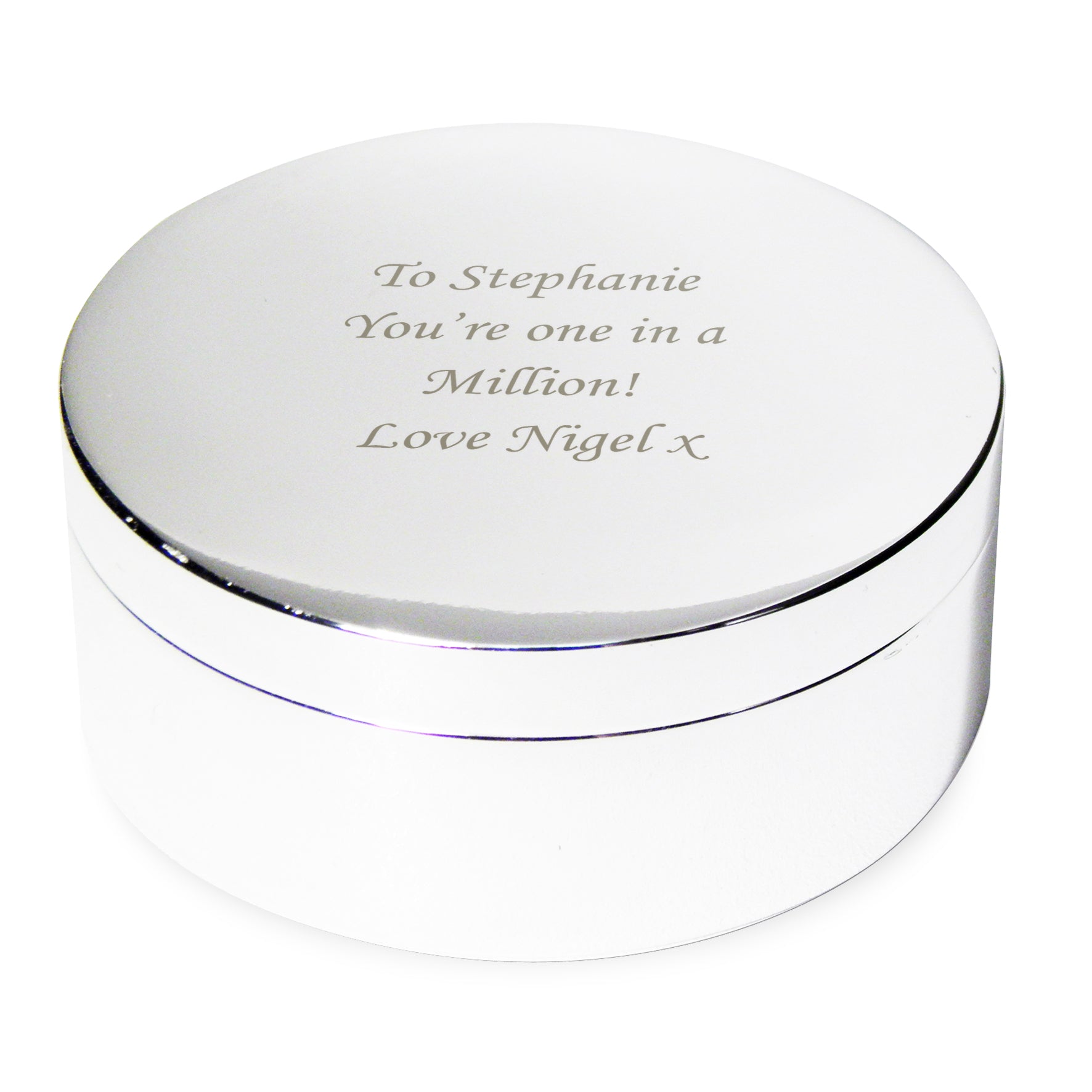 This two piece round trinket box can be personalised on the lid of the trinket with any message over 4 lines and up to 20 characters per line.