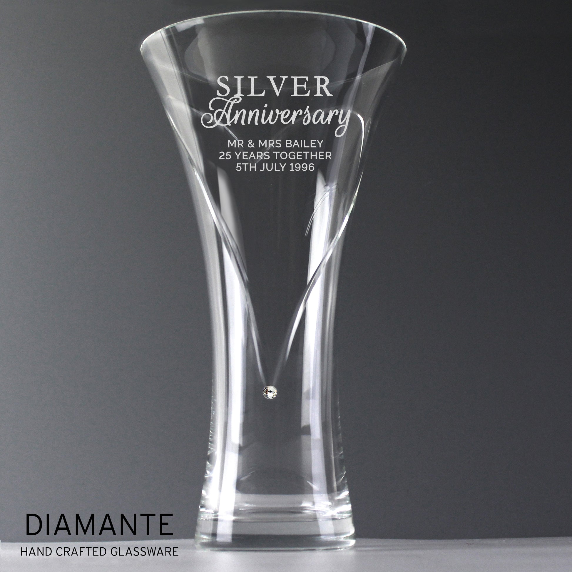 Personalised Silver Anniversary Large Hand Cut Diamante Heart Vase