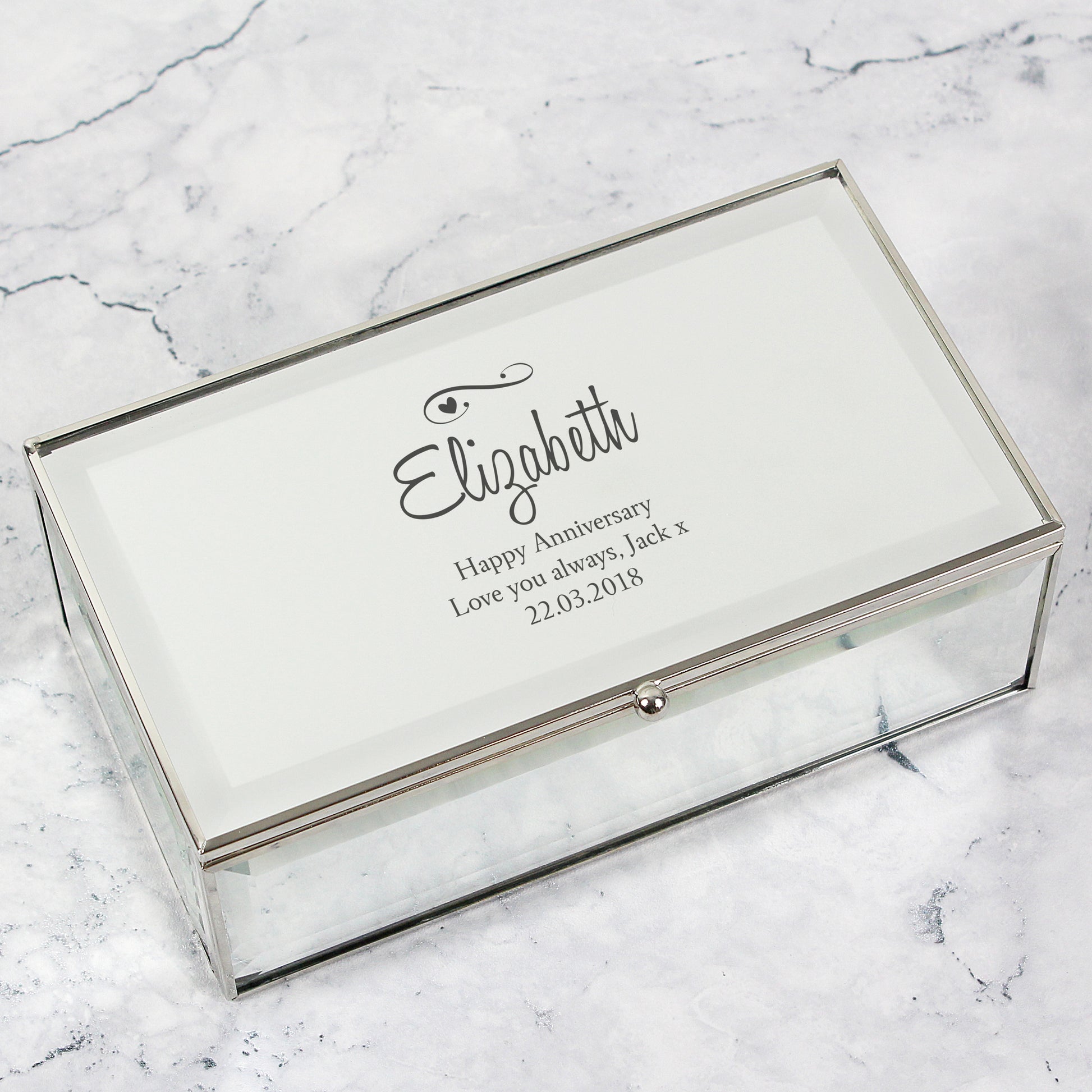 This clean modern Personalised Hearts & Swirls design jewellery box with mirrored finish, features three compartments to store your jewellery.