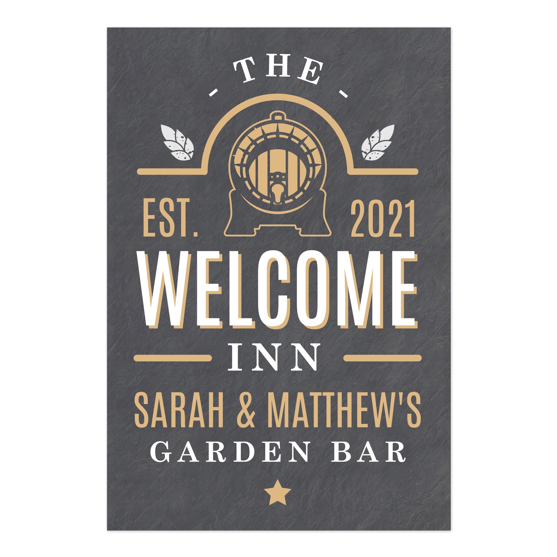 Personalise this sign with a year up to 4 characters long and 2 message lines. Line 1 has 20 characters available and line 2 has 12 characters available. "The Welcome Inn" and "EST." is fixed text.