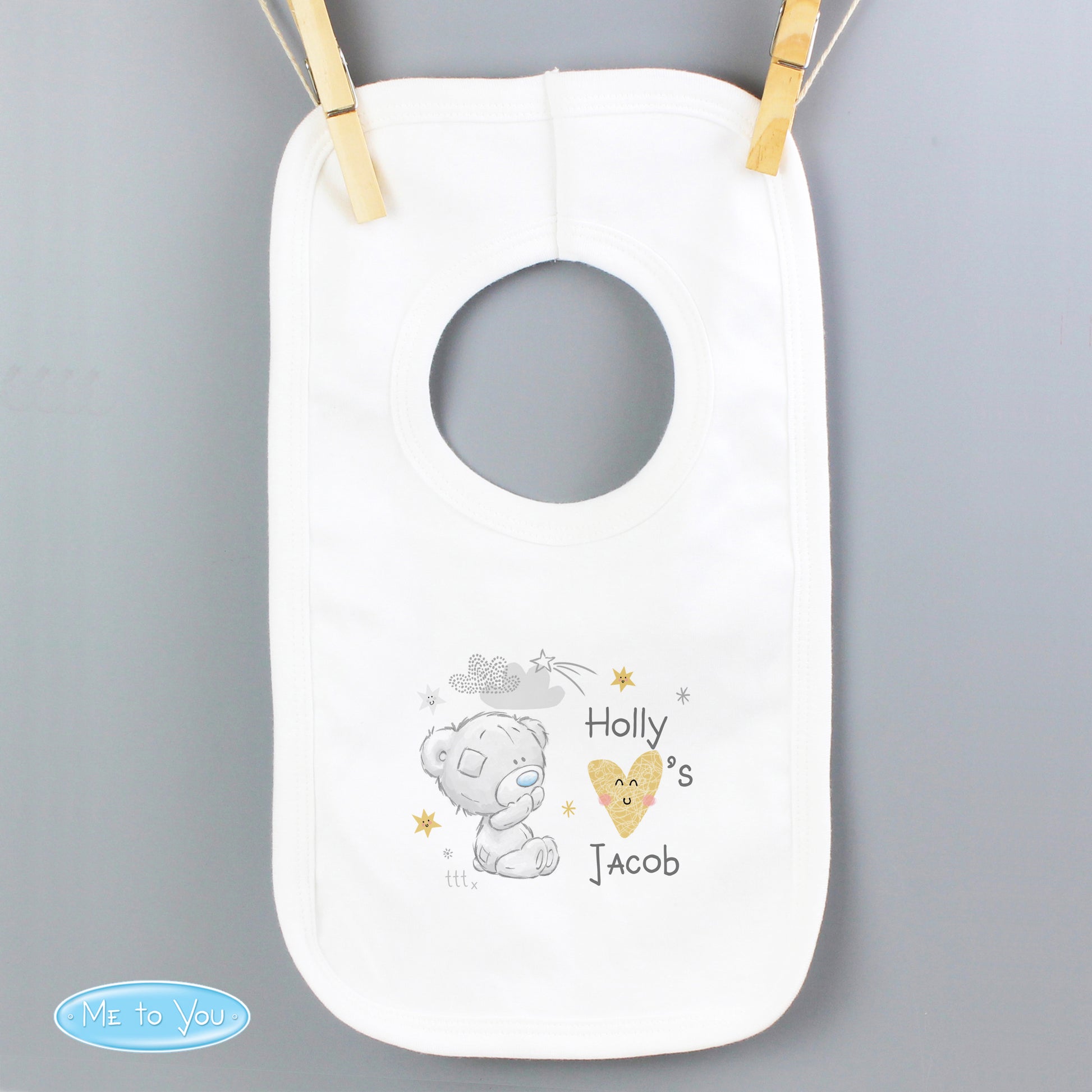 Personalise this Me To You Tiny Tatty Teddy I Heart Baby Bib with two names up to 12 characters in length.