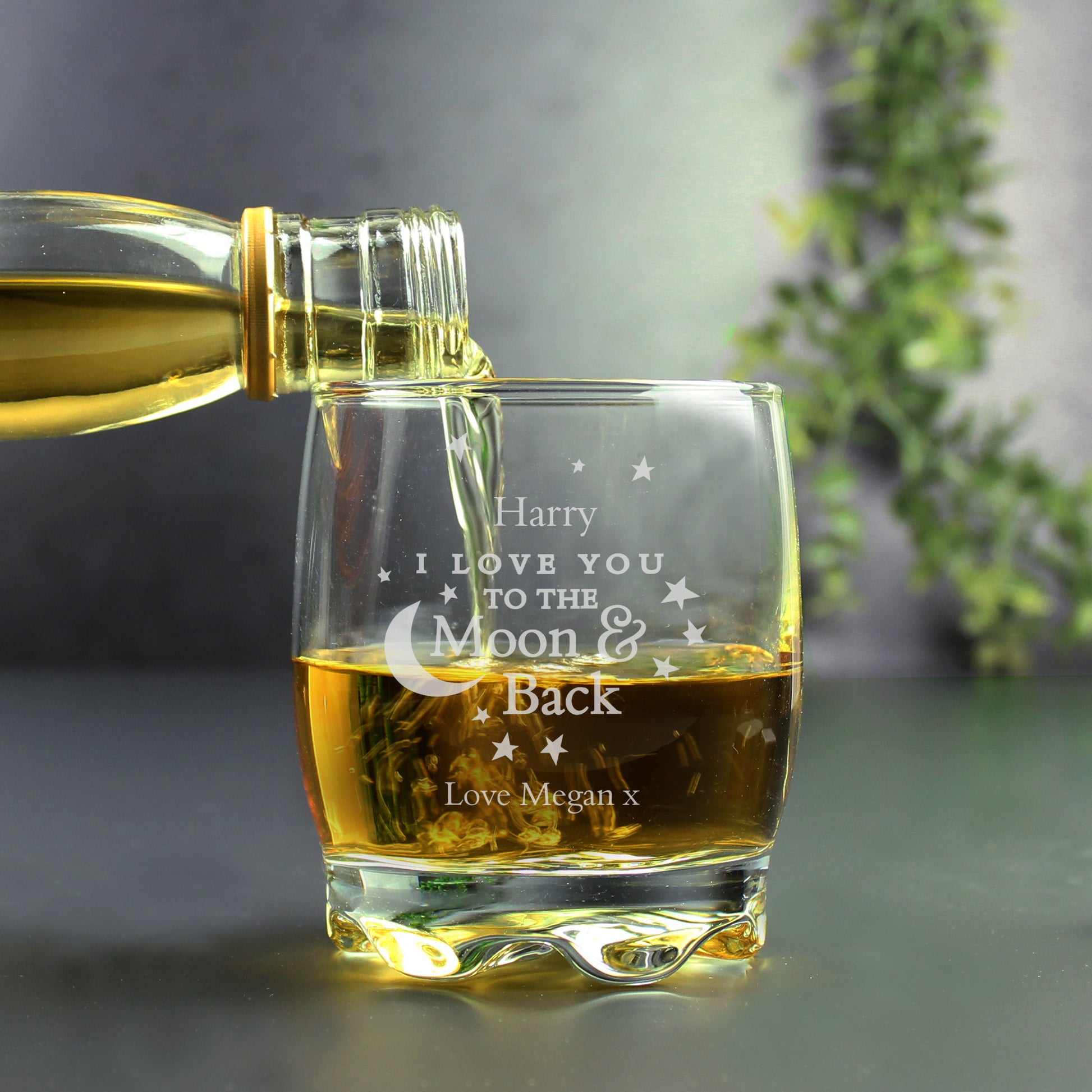 Personalise this whisky glass with a name up to 12 characters in length and 1 line of 20 characters for a message at the bottom. The words 'I love you to the moon and back' are fixed. Personalisation is case sensitive and will appear as entered.
