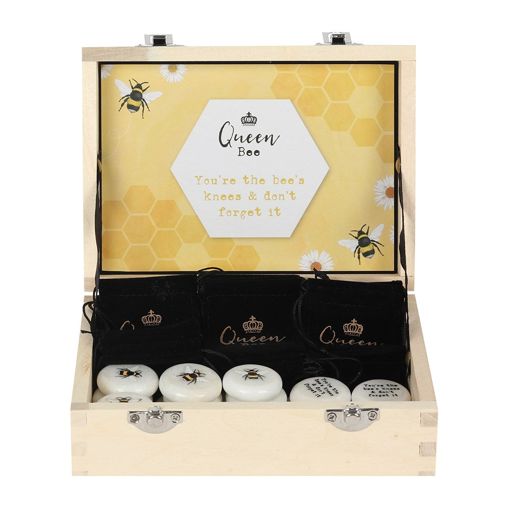A wooden box display of pocket size lucky charm stones. Each stone features a colour image of a Bee on one side with the words 'You're the bee's knees & don't forget it' on the other. Complete with small black gift pouch. 24 charms in each box.