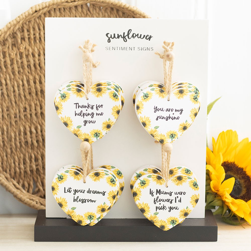 Set of 24 Sunflower Heart Sentiment Signs on Display
