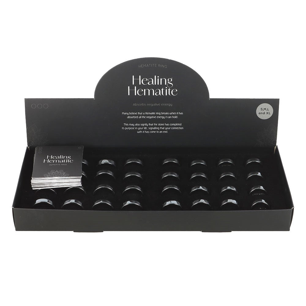 Absorb negative energy with this set of 32 hematite rings in a matching countertop display. Known for its ability to absorb negative energy, hematite is believed to break once it has absorbed enough, symbolising the release of harmful influences. This set includes 32 rings in small, medium, large and extra-large sizes, offering a perfect fit for everyone. Designed by Something Different Wholesale and part of the Healing Hematite range of hematite crystal accessories.