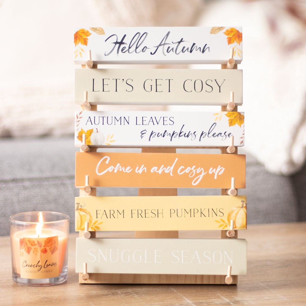 This display of 36 block signs includes 6 different designs perfect for welcoming the autumn season. Phrases include: Let's Get Cosy, Hello Autumn, Come in and Cosy Up, Farm Fresh Pumpkins, Snuggle Season, and Autumn Leaves & Pumpkins Please. Sold as a set of 36 signs on a matching wooden peg display. Designed by Something Different Wholesale and part of the Autumn Accents range of seasonal gifts and home decor.