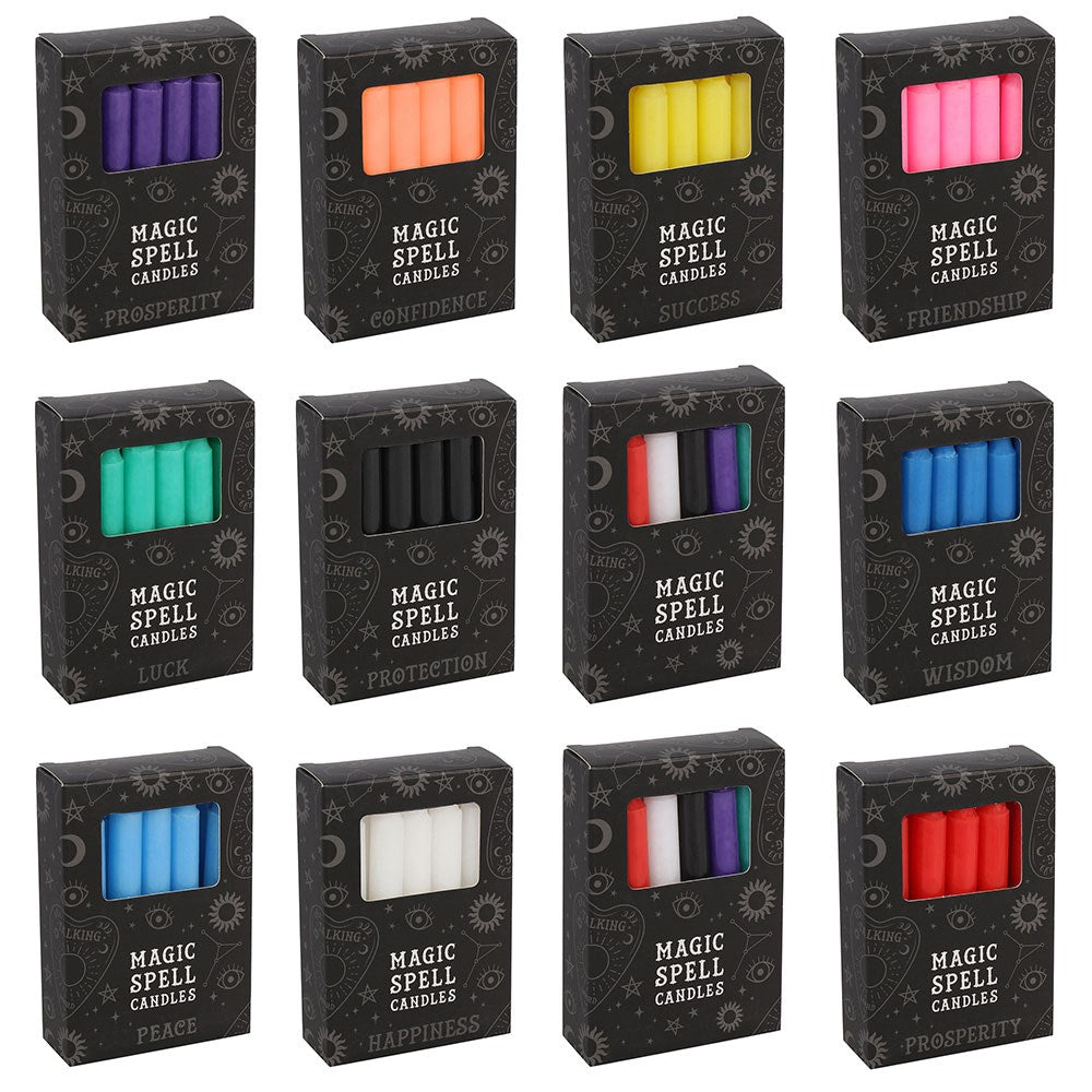 This set of 72 unscented spell candle packs is designed for easy top-ups and custom merchandising displays. Candle magic is one of the simplest forms of spell casting in which the caster decides on a goal, visualizes the end result and focuses intent or will to manifest that result. Typically the caster will write down their intent on a piece of paper the same colour as the candle, and burn the paper in a fire safe bowl. This set includes 6 packs of each solid colour and 12 packs of our mixed variety, with each pack containing 12 individual spell candles. Colours include purple for prosperity, orange for confidence, yellow for success, pink for friendship, green for luck, black for protection, blue for wisdom, light blue for peace, white for happiness and red for love. All of our spell candles are solid colour all the way through (not dipped). Each candle has an approx burn time of 1 hour. Made from paraffin wax. Colour may vary slightly between production batches. Designed by Something Different Wholesale and part of the bestselling Black Magic range of gothic gifts and home decor.