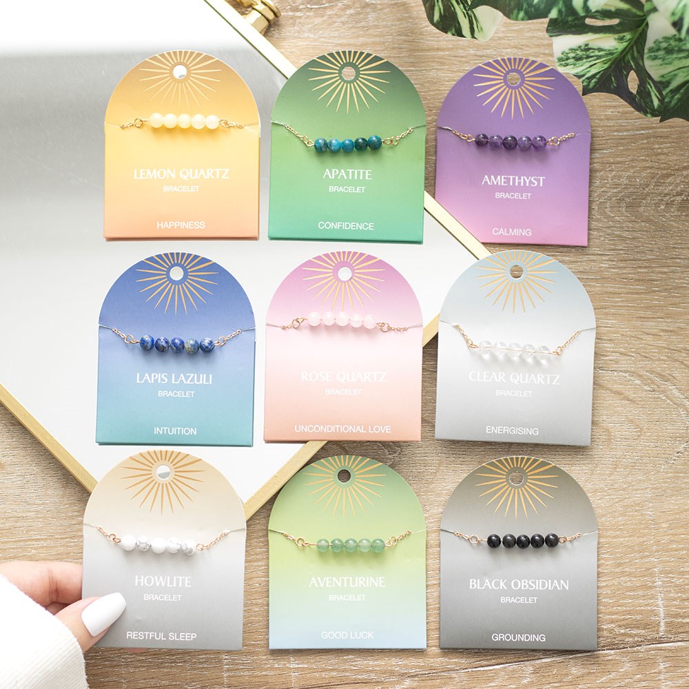 Carry the power of crystal healing on-the-go with this set of 9 crystal beaded chain bracelets. Each bracelet features 5 gemstone beads that are strung on a delicate yet durable gold-tone chain. Ideal for stacking or wearing individually for a touch of elegance to any outfit. Add a zodiac charm to the bracelet for a personalised touch (sold separately). This set includes 1 of each of the following crystal bracelets: Black Obsidian, Clear Quartz, Amethyst, Apatite, Lemon Quartz, Howlite, Lapis Lazuli, Rose Quartz and Aventurine. Also sold separately and as part of a countertop spinner stand. Jewellery is nickel-free stainless steel. Designed by Something Different Wholesale and part of the Crystal Charm Jewellery range.