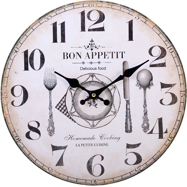 A 34cm shabby chic clock in a bon appetit design. Made from MDF. 1 x AA battery required. 34cm Diameter