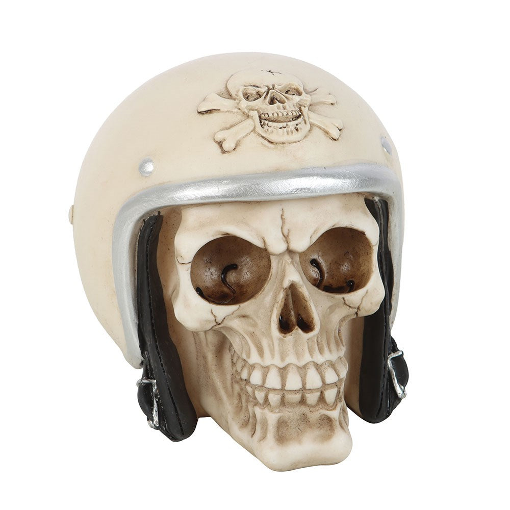 This realistic resin skull ornament wears a retro motorbike helmet accented by a skull and crossbones design. Highly detailed with handpainted details, this eye-catching figurine will be a welcome addition to any gothic skull or motorcycle collection.