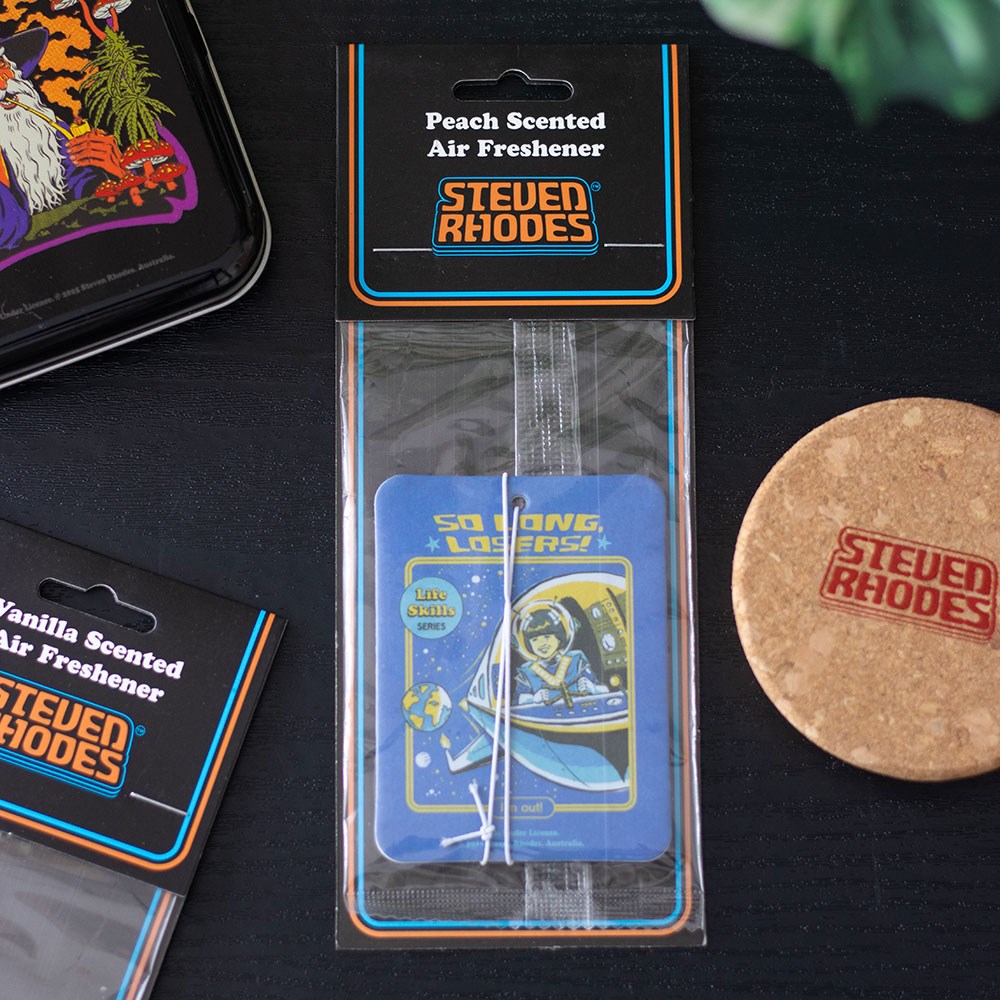 Blast off from your responsibilities in a cloud of peachy defiance.This So Long Losers air freshener by Steven Rhodes is for anyone mentally checking out while physically stuck in traffic. Officially licensed and part of the Steven Rhodes collection of iconic retro gifts.