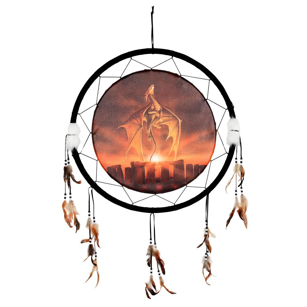 A large dreamcatcher featuring stunning licensed artwork from gothic artist Anne Stokes with bead and feather accents. Printed with a stunning dragon in front of the summer sunrise at Stonehenge, 'Solstice' is an eye-catching addition to an otherwise traditional design. Officially licensed and exclusive to Something Different Wholesale.