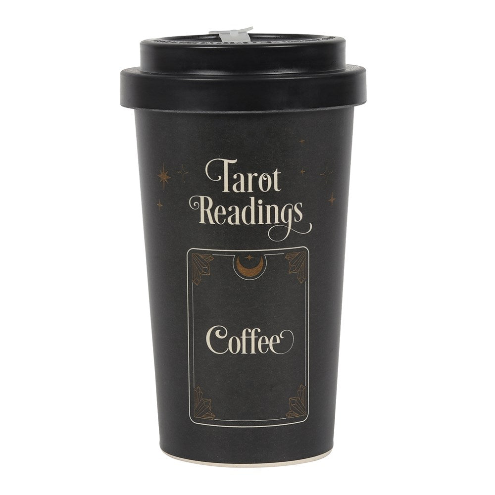 This eco-friendly, reusable travel mug is made out of durable bamboo fibre and comes with a matching silicone sleeve and lid for keeping hydrated (and caffeinated) on the go. This mystical style features a coffee tarot card design with 'Tarot Readings' text and also includes a convenient stopper to prevent accidental spills. Designed by Something Different Wholesale. Dishwasher safe mug with hand wash only lid and sleeve. Do not microwave. Our BPA-free eco bamboo products are made of 40% sustainable bamboo fibre, 40% resin and 20% corn starch