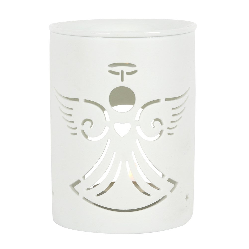 This white ceramic oil burner features a cutout angel figure in a cute, contemporary design. Place fragrance oil or wax melts into the built-in dish with a standard tealight inside to fill the home with calming fragrance. Designed by Something Different Wholesale.